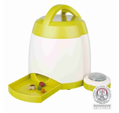Memory Trainer 2.0 Strategispel utmanande spel för proffs: genom att trycka på fjärrkontrollen får hunden godsakernas roterande behållare inuti matautomaten med justerbar öppning för att justera utsläppet av godsaker ökande svårighetsgrad på grund av det ökande avståndet mellan frigöringsknappen och matautomaten : i slutändan kan de till och med placeras i olika rum extra hållare för att öka stabiliteten på frigöringsknappen olika sätt att fästa frigöringsknappen med sugkopp eller pinne för utsidan inkluderar liten skopa för fyllningsområde upp till 40 m halkfri på grund av gummifötter mikro-USB-kabel (1,5 m) medföljer kan drivas med batterier eller via USB-kabel med nätkontakt (3 AAA mikro- och 4 C babybatterier ingår ej) ta ur batterierna när du använder mikro-USB-kabeln (ingår) och en separat tillgänglig USB-nätkontakt (Eurokontakt art.nr 12709) plast inkl. utbildningsinstruktioner i överensstämmelse med djurskydd enligt § 18 (AT)