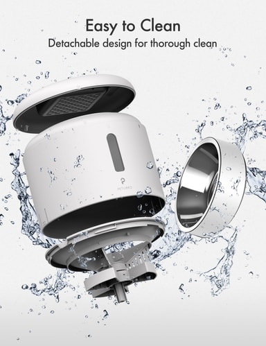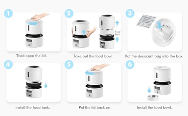 Den automatiska mataren har ett enkelt påfyllningssystem tack vare vridlåslocket, så att du kan fylla mataren och stänga den, vilket håller din katt borta. Locket har en torkmedelspåse som håller maten fräsch längre. Enheten har en anti-tilltäppningskonstruktion med tre element, inklusive silikonrotor, segmenterad struktur och IR-sensor som stoppar utmatningen om maten fastnar eller skålen är full.