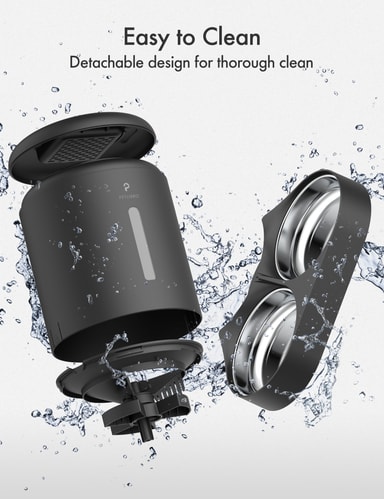Mataren har en avtagbar design som är lätt att rengöra, vilket gör det enkelt att avlägsna damm och partiklar med vatten. Mataren drivs med en USB-C-kabel och kan utrustas med tre D alkaliska batterier, vilket gör att mataren fungerar även under ett strömavbrott.