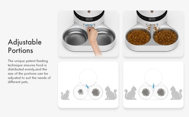 Tack vare det justerbara utfodringsschemat kan du sluta oroa dig för att glömma att mata din kattvän och se till att den får mat i tid. Se till att din katt inte äter för mycket eller för ofta tack vare portionskontroll. Schemat och portionsmängden kan enkelt justeras med hjälp av displayen och knapparna.