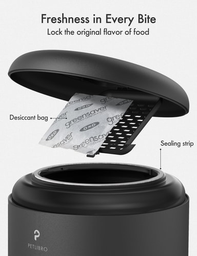Foderautomaten har ett enkelt påfyllningssystem tack vare locket med vridlås, så att du kan fylla och stänga foderautomaten och hålla din katt borta. Locket har en torkpåse som håller maten fräsch längre. Mataren har en design med tre element som förhindrar igensättning, inklusive en silikonrotor, segmenterad struktur och IR-sensor som stoppar matningen om maten fastnar eller skålen är full. Den justerbara avdelaren gör att du kan dela upp måltiderna efter dina önskemål.