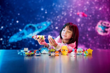 Barn sätter ihop de färgglada klossarna och bygget en leksaksraket, en utomjording, en astronaut och ett minisolsystem med Mars, jorden, solen och Saturnus med sina ringar. Rymdmodellerna kan sedan specialdesignas med olika färger, former, ögon, uttryck och ett ställ som gör att modellen kan rotera. Det finns även självlysande klossar så att den syns i mörker. Den kosmiska kreativiteten fortsätter med förslag på alternativa byggen, däribland ett komplett solsystem med 8 planeter. Guider och digitala funktioner finns även tillgängliga i appen LEGO Builder.