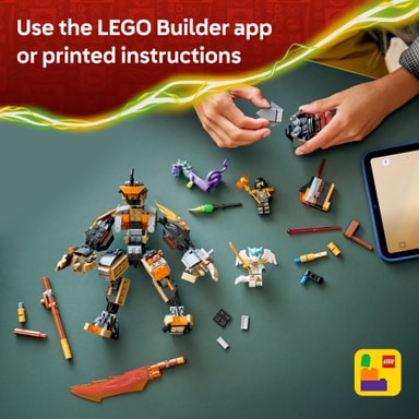 Roboten har 3 vapen: ett svärd, en stav och en kanon med fjädermekanism och 2 pilar, som barn kan byta ut mot vapen från setet Ninjadraken Riyus strid (71855) (säljs separat). Denna NINJAGO leksak innehåller även 3 minifigurer: Cole med en hammare, Zane i drakform med ett svärd och ett syramonster med en stav för roliga stridslekar.