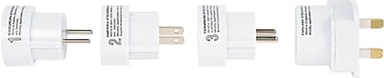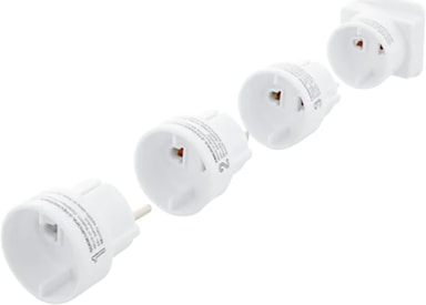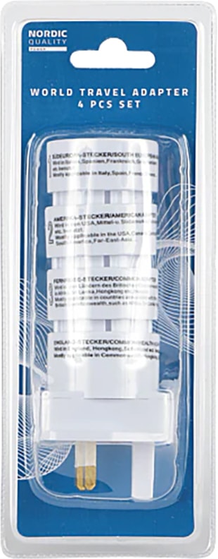 Förpackningen innehåller fyra adaptrar frånNordic Quality som används för att kunna använda elkontakter i Europa och Asien. De fungerar även i USA och i de nordiska länderna.