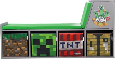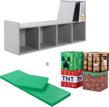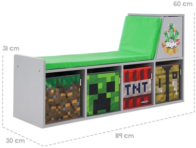 Phoenix Minecraft-bänk förbättrar ditt barns rum med en stilren grå design, bekväm skumgummidyna och fyra rymliga förvaringslådor. Den erbjuder multifunktionell sittplats och smart förvaring för leksaker och böcker, perfekt för unga äventyrare.Läs mer om produkten