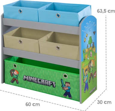 Phoenix Minecraft-spelhylla förvandlar ditt barns rum till ett pixlat äventyr med sin autentiska design, hållbara MDF-konstruktion och praktisk förvaring med fyra små och en stor tygbox för leksaker och böcker.