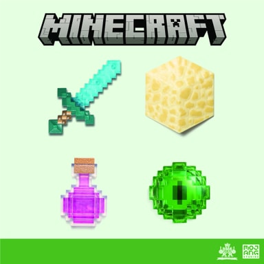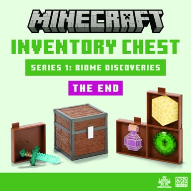Noble Collection Minecraft Loot kistleksak förställer en skattkista från Minecrafts The End-dimension, som innehåller ett genomskinligt blått svärd, en dryckesflaska, ett gult block och ett grönt klot.Läs mer om produkten