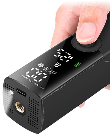 Den har ett inbyggt uppladdningsbart batteri och 4 förinställda trycklägen för däck, bollar och andra uppblåsbara föremål, vilket gör pumpningen snabb och enkel.