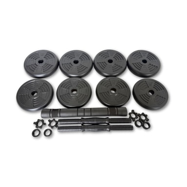 Det mångsidiga ASG justerbara viktsetet på 15 kg ger dig allt du behöver för ett omfattande träningspass hemma. Med det här setet kan du enkelt växla mellan hantelträning och skivstångslyft. Multifunktionella skivstänger: Två 43 cm skivstänger som kan användas individuellt som hantlar eller kopplas samman med en 40 cm koppling för att skapa en lång skivstång. Inkluderar 14 kg viktskivor i olika storlekar (1,5 kg, 1,25 kg och 2 kg).