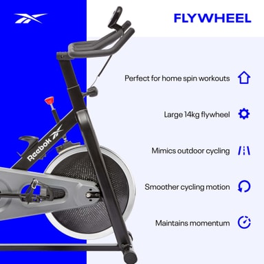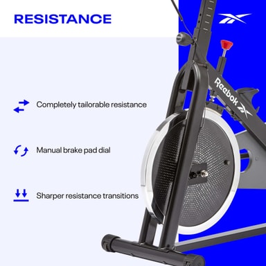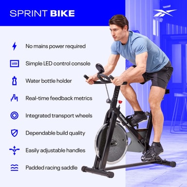 Gjord för att efterlikna känslan av utomhuscykling Reebok Sprint Bike erbjuder en mer realistisk inomhuscykelupplevelse. Designad för att lagra din energi och bibehålla ditt momentum skapar cykeln en mjukare cykelrörelse och mer konsekvent kadens jämfört med traditionella motionscyklar. Med ett stort 14 kg kedjedrivet svänghjul ger Sprint Bike dig total kontroll över din intensitet med helt anpassningsbart motstånd via bromsbeläggsratten. Bromsbeläggsratten är manuellt justerbar utan att behöva gå igenom stegvisa nivåer och tillåter skarpare motståndsövergångar för dina spinnträningar hemma.