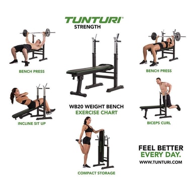 Denna viktbänk är designad för dig som tränar hemma. Tunturi WB20 erbjuder olika träningsalternativ. Tack vare sin utmärkta bärförmåga kan du förvandla vilket sovrum som helst till ett litet träningsområde i hemmet. Vik bara bort bänken efter träningen. Träna hemma med en viktbänk Skapa ett sluttande ryggstöd med den justerbara sitsen. På så sätt förvandlar du viktbänken till en buk-tränare. Justerbart fotstöd. Välj en av de tre positionerna för att skapa olika träningsnivåer. Justeringssystemet är användarvänligt och snabbt: Byt position utan svårighet. Använd remmen för att fästa benen på bänken. Träna säkert. Tyngdbänken har skivstångsstöd, här kan du placera en skivstång. Fem justerbara höjder säkerställer att stöden är i din idealhöjd. På så sätt kan alla träna ordentligt. Träna dina armmuskler med dippstativet. Denna Tunturi viktbänk har dipp handtag som gör att du kan göra dipps på skivstångsstödet. Den sydda sitsen med extra rubusta hörn garanterar, att du kan använda din viktbänk i många år och förhindrar slitage på ömtåliga delar. Ramen är gjord av robust stål som säkerställer den nödvändiga styrkan. Den svarta matta pulverlackeringen ger bänken ett elegant utseende. De halkfria golvskydden i gummi förhindrar skador på golvet. Med denna kompakta viktbänk sparar du utrymme. Vik viktbänken och placera WB20 i upprätt läge med en knapptryckning. På så sätt passar den in i alla hörn av ditt hem.