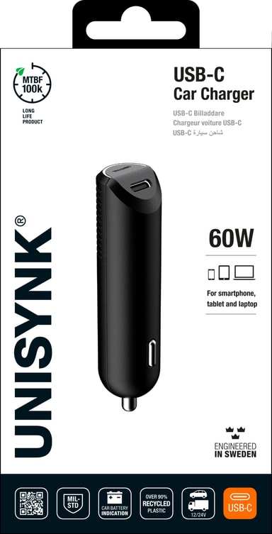 Unisynk 60W USB-C billaddare gör att du kan ladda din enhet när du reser, samtidigt som du kontrollerar bilbatteriets tillstånd tack vare den inbyggda färgkodade LED-ringen. Den är designad för att klara 100 000 non-stop laddning i genomsnitt.Läs mer om produkten