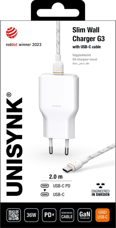 Ladda din telefon med snabba Unisynk G3 36W USB-C väggladdare med 2 m USB-C-kabel. USB-C-laddarkitet ger snabba laddningshastigheter för din telefon var du än är, och tack vare den kompakta storleken och det medföljande telefonstället kan du enkelt luta den mot väggen - perfekt för resan. Laddaren kommer med en 2-meters USB-C-kabel.