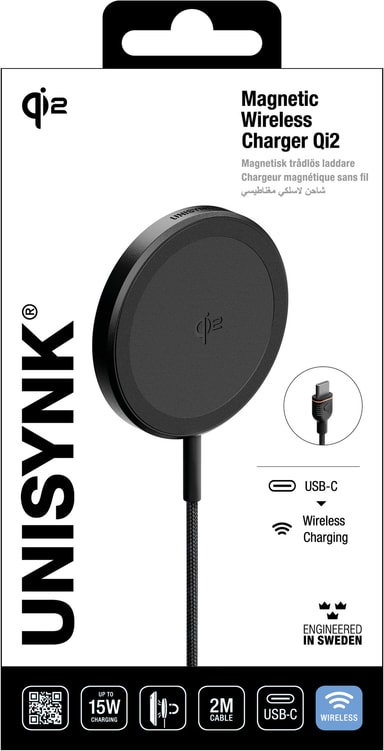 Unisynk Qi2 15 W trådlös laddare håller din MagSafe-telefon på plats medan den laddas med 15 W effekt. Den är Qi-kompatibel och kommer med en 1,8 m kabel – ladda säkert och snabbt.Läs mer om produkten