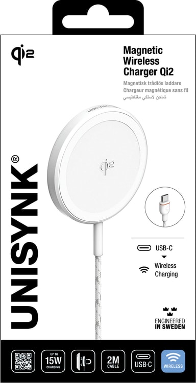 Unisynk Qi2 15 W trådlös laddare håller din MagSafe-telefon på plats medan den laddas med 15 W effekt. Den är Qi-kompatibel och kommer med en 1,8 m kabel – ladda säkert och snabbt.Läs mer om produkten
