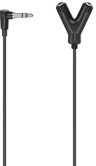 En kompakt Hama ljudadapter för att ansluta två par hörlurar till en utgång, perfekt för att två personer ska kunna lyssna på samma källa på t.ex. resor.