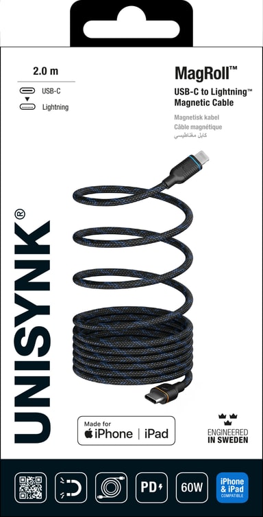 • Unisynk MagRoll Magnetic 60W USB-C- till Lightning-adapter (2m)