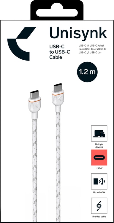 Unisynk USB-C till USB-C laddningskabel är 1,2 meter lång och tillverkad av slitstark nylon med en flätad rund design. Den stöder snabbladdning upp till 240 W.Läs mer om produkten