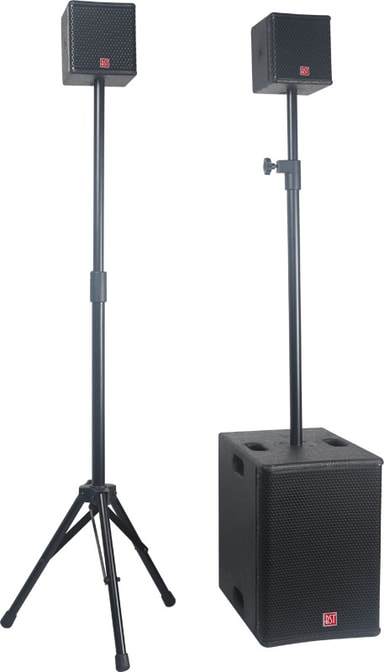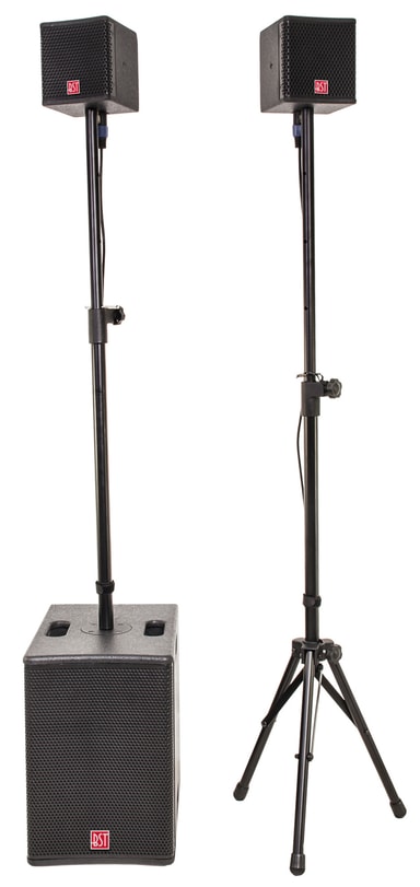 1 x aktiv 10""/25cm subwoofer i basskåp med Ø20mm hål för mellanrör. Klass D förstärkare med DSP. 5 DSP-förinställningar (vokal-live1-live2-dj1-dj2). Ingångar och utgångar via Powercon-kontakt. Länka utgång via XLR till en annan förstärkare. Separat nivå subwoofer och satelliter. Justerbar delningsfrekvens för subwoofer (80Hz till 200Hz). Inbyggd limiter. LED-indikator för alla funktioner (ström, skydd, signal & begränsare). Bakgrundsbelyst BST -logotyp (med på/av-knapp). Mono/stereo funktion (via en knapp på kontrollpanelen). Inbyggt handtag för enkel transport. Satelliter. 10 cm (4"") mellanhögtalare. Passiv 2-vägs delfilter och PTC-skyddskrets för mellanhögtalare. 9 mm tjockt MDF-skåp med grov finish. Grill i stål med akustiskt tyg. Lämplig för transport med bil. Högtalarkabel för satelliter ingår.