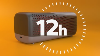 Denna högtalare har ett kraftfullt litiumjonbatteri som tillåter 12 timmars speltid på en enda laddning.
