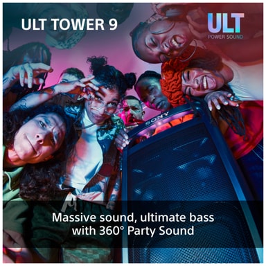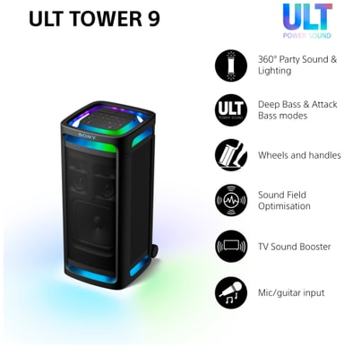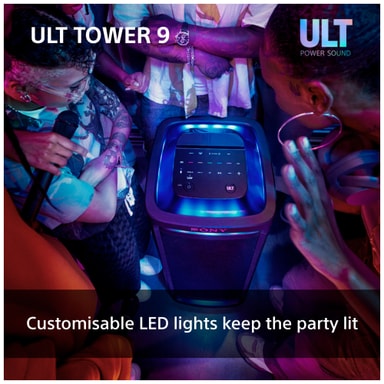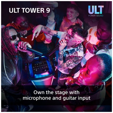 Sony ULT Tower 9 bärbar partyhögtalare kommer att se till att festen blir lyckad. Fantastiska ljudinställningar med X-Balanced-högtalare garanterar ett otroligt ljud med djup bas och 360° spridning. Anslut dina smarta enheter via Bluetooth och streama dina favoritlåtar och imponera på alla med LED-ljusshowen. Välj mellan 2 specialiserade ljudlägen och bli kvällens stjärna med mikrofon- och gitarringångarna.