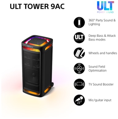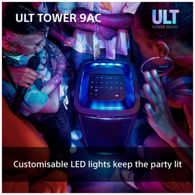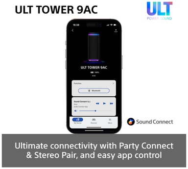 Med Party Connect kan du trådlöst länka upp till 100 kompatibla Sony-högtalare via Bluetooth för en ännu större ljudupplevelse. Om du har en andra ULT Tower 9AC-högtalare kan du använda Stereo Pair för att skapa en kraftfull vänster-höger-stereouppsättning.