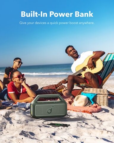 Denna högtalare har upp till 24 timmars speltid på en enda laddning, vilket gör den perfekt för heldagsevenemang och fester som varar hela natten. Den integrerade powerbank-funktionen låter dig även ladda dina enheter på språng.