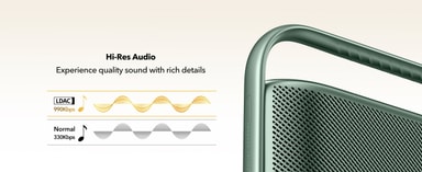 Högtalaren är certifierad för Hi-Res Audio, vilket innebär att den kan återge ljud med exceptionell klarhet och detaljrikedom, så att du kan höra subtila nyanser i din musik. Den stöder LDAC-codec över Bluetooth 5.3, vilket möjliggör högupplöst ljudströmning från kompatibla enheter och säkerställer detaljerad och dynamisk ljudåtergivning.