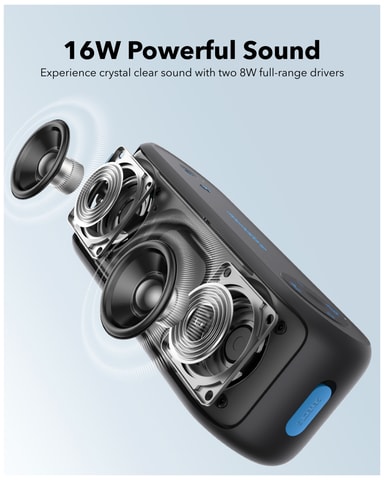 De dubbla drivrutinerna med 16W RMS levererar utmärkt stereoljud som kan förbättras ytterligare genom att koppla ihop fler Soundcore-högtalare.
