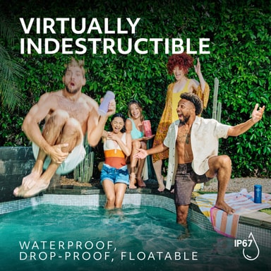 Även om din UE BOOM 4-högtalare blir blöt eller smutsig fortsätter festen, eftersom den här högtalaren kommer med IP67-klassificering, vilket betyder att den är helt damm- och vattentät. Ta den med dig till duschen, poolen eller stranden, bär runt den på regniga dagar eller gör den lerig.