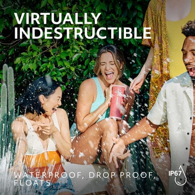 Även om du får din UE MEGABOOM 4-högtalare blöt eller lerig, fortsätter festen, eftersom denna högtalare kommer med IP67-klassificering, vilket betyder att den är helt damm- och vattentät. Ta den med dig till duschen, poolen eller stranden, bär runt den på regniga dagar eller gör den lerig. Om det blir smutsigt är det bara att skölja av det och fortsätta med festen. Med en robust konstruktion och 1 meters fallskydd tar sig den här högtalaren runt utan problem.