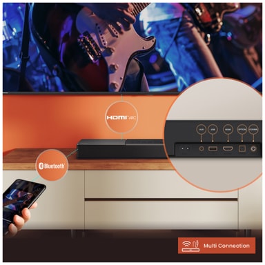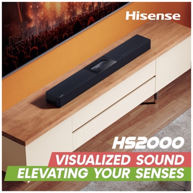 Förbättra ljudet från din TV med Hisense 2.1-kanals soundbar HS2000. Det högkvalitativa ljudet levereras av en inbyggd subwoofer, Dolby Atmos och DTS Virtual-X, medan du enkelt kan ansluta dina enheter via Bluetooth.Läs mer om produkten