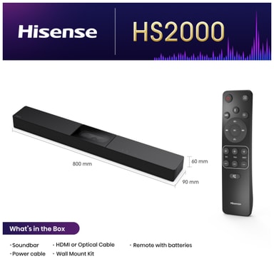 Hisense 2.1ch HS2000 soundbar är den perfekta ljudkompanjonen till din TV. Upplev det fantastiska ljudet från Dolby Atmos och DTS Virtual-X och höj basnivåerna med den visualiserade inbyggda subwoofern
