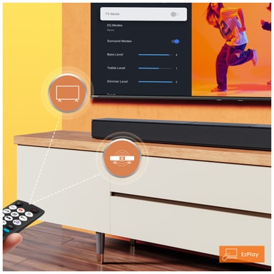 Skapa en otrolig ljudbild med bara din soundbar och TV tack vare TV Mode. Om din TV stödjer TV Mode kommer det att avsevärt förbättra ljudet från din soundbar utan någon ytterligare hårdvara. EzPlay-funktionen gör det möjligt för dig att hantera din soundbar med din Hisense TV:s fjärrkontroll.