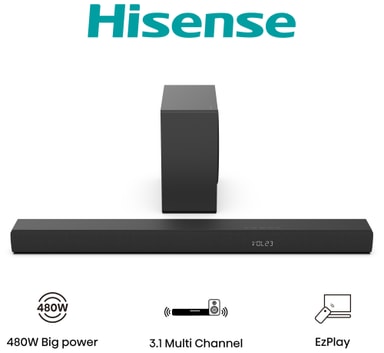 Hisense 3.1ch HS3100 soundbar levererar enastående ljud direkt till ditt vardagsrum. Upplev det fantastiska ljudet från Dolby Atmos och DTS Virtual-X och förstärk basnivåerna med den medföljande trådlösa subwoofern. Strömma dina favoritmedier via Bluetooth och missa inga röstreplikerna tack vare Voice Enhancement Technology.