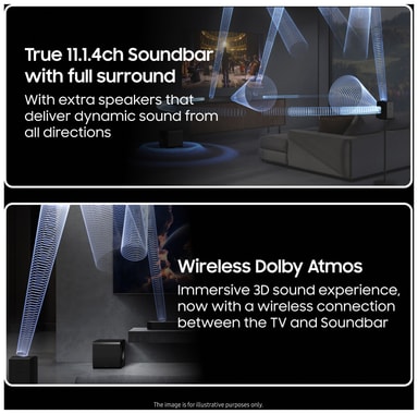 Samsung 11.1.4ch HW-Q995F soundbar ger dig en otrolig surroundljudupplevelse tack vare trådlös Dolby Atmos Adaptive Sound. Njut av den djupa basen från den medföljande subwoofern medan SpaceFit Sound Pro optimerar ljudet baserat på ditt rums akustik.Läs mer om produkten