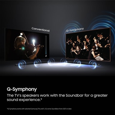 Para ihop denna soundbar med vilken Samsung-TV som helst som är kompatibel med Q-Symphony för att skapa en otrolig ljudbild där din TV, soundbar och TV-högtalare fungerar i fullständig harmoni. Resultatet är ett uppslukande surroundljud som du inte lätt glömmer.