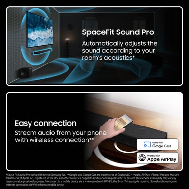 Para ihop denna soundbar med vilken kompatibel Samsung-TV som helst för att skapa en otrolig ljudscen där din TV, soundbar och TV-högtalare arbetar i perfekt harmoni.