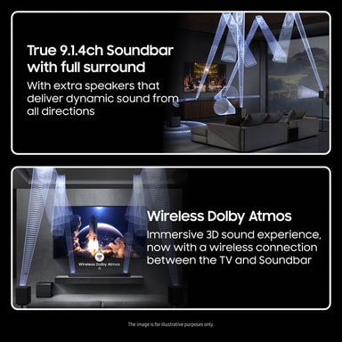 Upplev det imponerande trådlösa Dolby Atmos som levererar ett omslutande ljud fullt av rikedom och djup. Denna ljudteknik levererar flerdimensionellt ljud och får musik, människor eller saker att komma till liv.