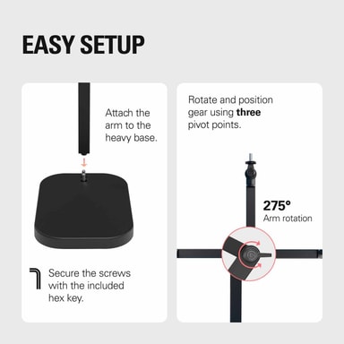 Den har en ledad arm med två justerbara vridpunkter, vilket gör att du kan rotera och positionera din utrustning i olika vinklar. Tack vare den solida metallkonstruktionen kan den hålla utrustning upp till 1 kg. Den viktade basen ger stabilitet och förhindrar att stativet välter, även med tyngre mikrofoner eller kameror monterade.