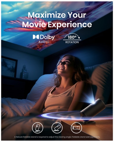 Tack vare en kompakt, portabel design och utmärkt video- och ljudkvalitet är Nebula Capsule 3 laserprojektor perfekt för att titta på film eller spela spel under dina resor. Med Full HD-upplösning och en ljusstyrka på 300 ANSI lumen ger den klara och levande bilder som passar för olika miljöer. De inbyggda 8W Dolby Digital-högtalarna levererar ett fylligt surroundljud som imponerar. Projektorn är utrustad med en laserkälla som garanterar en lång livslängd på upp till 30 000 timmar, medan autofokus och keystonekorrigering säkerställer enkel användning. Med 2,5 timmars batteritid för filmvisning eller 8 timmars batteritid för musikuppspelning kan denna lätta projektor användas var som helst och när som helst.