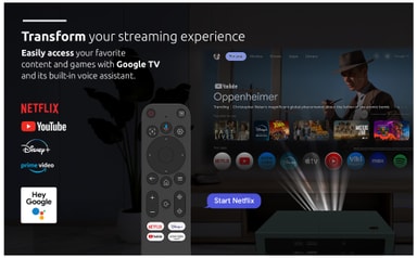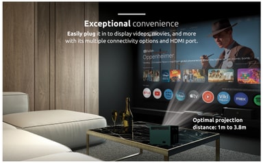 Bluetooth och Google Assistant-funktioner ger enkel anslutning och kontroll. Projektorn har också ett hörlursuttag för personlig lyssning och en HDMI 2.0-anslutning för hög bild- och ljudkvalitet.