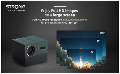 Strong Mira 1-projektorn erbjuder FHD 1080p-upplösning, autofokus, Google TV-streaming, keystonekorrigering och en skärmstorlek på 40"-150" med klara 300 ANSI Lumen, inbyggda högtalare och Google Cast för smidig mediaöverföring.Läs mer om produkten