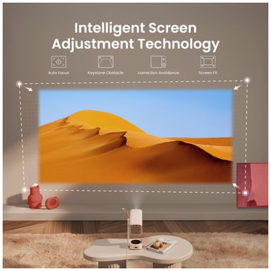 Tack vare denna funktion får du total flexibilitet när du placerar din projektor. Den automatiska vertikala och horisontella justeringen säkerställer att projektioner alltid visas korrekt. Detta förbättras ytterligare genom användning av Intelligent hinderavkänning och Intelligent skärmjustering.