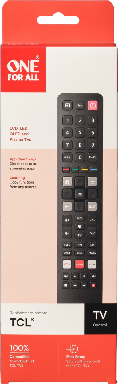 Hantera din TCL TV enkelt med OFA URC 4922 ersättningsfjärrkontroll. Denna infraröda fjärrkontroll fungerar sömlöst med alla typer av TCL- och Thomson-TV-apparater, har inlärningsfunktion, 3 app-genvägsknappar och är lätt att ställa in.Läs mer om produkten