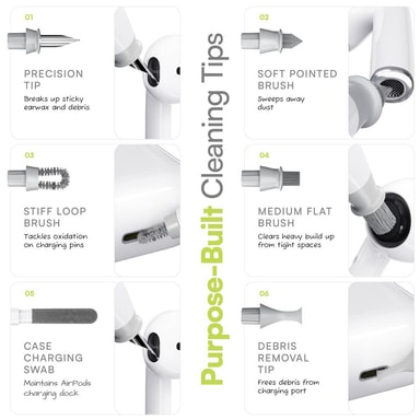 Rengör telefonens laddningsport, dina hörlurar eller annan enhet med hjälp av KeyBudz AirCare 2.0 Premium rengöringskit. Kitet låter dig snabbt, effektivt och säkert rengöra öronvaxet från AirPods hörlursnät, ta bort skräp från telefonens laddningsport med mera. Det kommer med flera tips och borstar och är idealiskt för USB-C och Lightning-laddningsportar eller hörlurar. Kitet är kompatibelt med Apples riktlinjer och säkerställer att dina enheter inte skadas när de rengörs.