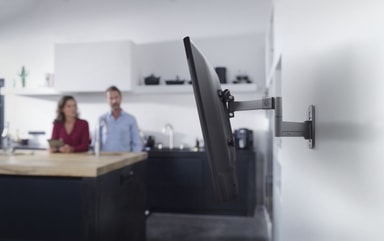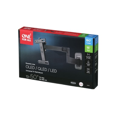 TV-fästet One For All TV med lutnings- och vridningsjustering passar för tv-apparater från 13 till 50 tum, och är kompatibelt med VESA-storlekar från 100 x 100 till 200 x 200. Luta din TV upp till 15° framåt eller bakåt och vrid 180° för att hantera solreflektioner eller reflektioner från inomhusbelysning, för att få den perfekt tittarplaceringen. Upptäck Dynamic Line, särskilt konstruerat för större och tyngre tv-apparater. Det här moderna fästet håller för en tv på upp till 50 kg. Det här moderna fästet kompletterar sin smarta konstruktion med en smidig förvaringsplats för nyckeln. Ändra enkelt lutningsposition på din tv med hjälp av den medföljande nyckeln och förvara den på baksidan av fästet så att du aldrig tappar den. De armar som tv-apparaten är monterade på har en mjuk vaddering för att skydda den monterade tv-apparaten. Dölj fula kablar med det inbyggda kabelhanteringssystemet och skapa ett rent och välstädat intryck. Allt fästmaterial såsom skruvar, vattenpass, pluggar och distanser levereras med fästet för en snabb och smidig montering. Du kan även ladda ned den kostnadsfria appen One For All, som är full av bra nstallationsverktyg. Tv-fästet One For All fungerar med alla typer av tv-apparater oavsett märke.