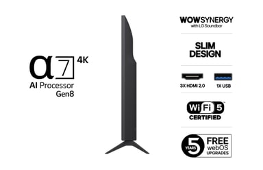 Tack vare 4K HDR, uppgraderad α7 AI Processor och anpassningsbar webOS ger UA75 en skarp bild, smidig prestanda och enkel streaming i en tunn design. En perfekt TV för daglig underhållning, nu kompatibel med Magic Remote (köpes separat).Läs mer om produkten