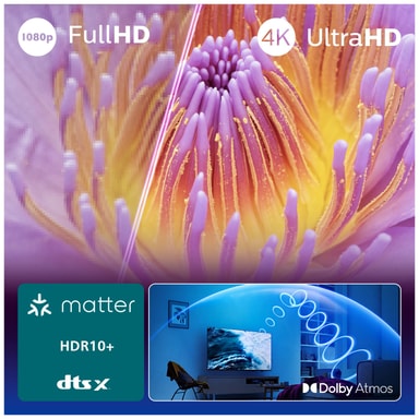 Upplev 4K UHD med revolutionerande färgdjup och kontrast tack vare kompatibiliteten med stora HDR-format (High Dynamic Range), inklusive HDR10+ och HLG. HDR-tekniken säkerställer att mörka områden i bilden ser mörkare ut, medan ljusa blir ljusare ut. Upplev en mer realistisk bild med fler färger, graderingar och nyanser och för din TV-upplevelse närmare en verklighetstrogen upplevelse.