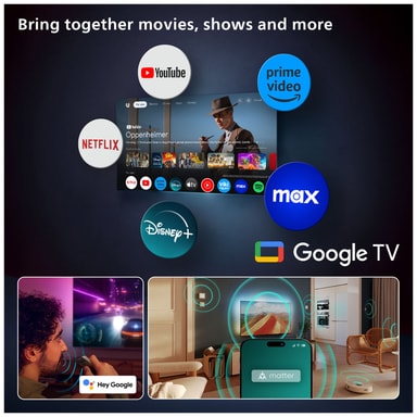 Operativsystemet Google TV ger enkel tillgång till en värld av underhållning. De intuitiva menyerna ger personliga rekommendationer för filmer, videor, serier, låtar, spel och mycket mer. Utforska appar i Google Cast och streama dina favoriter från vilken kompatibel enhet som helst.